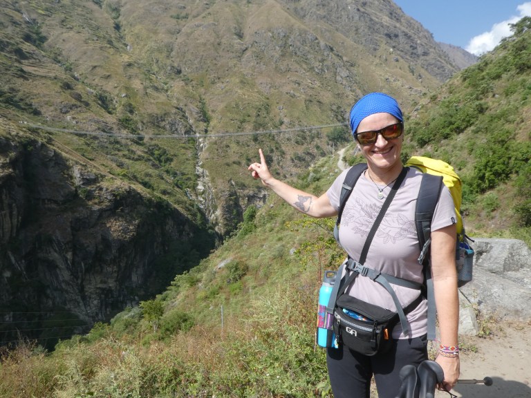 Ansonsten zieht sich der Weg ziemlich. Neben einem Stau auf einer Abbruchkante oberhalb des Flusses, der durch eine Schafherde verursacht wurde, sehen wir an drei unterschiedlichen Stellen Affen, außerdem eine Art Bergmaus und Ziegen sowie Kühe, die über lange Hängebrücken wandern.