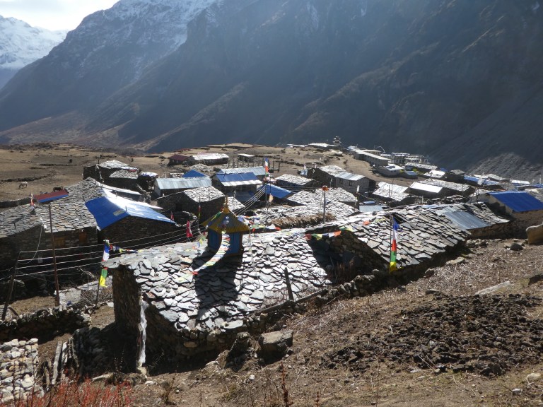 Dann laufen wir gemütlich los – es sind nur zwei Stunden bis Samagaun/Sama(Ryo), das etwas höher liegt, auf ca. 3600/3700 m. Wir sind fast allein unterwegs. Nur der Manaslu und die anderen Bergriesen begleiten uns. Die meisten anderen Trekker haben diese Etappe am Vortag gemacht. Dass wir antizyklisch unterwegs sind, ist gar nicht so schlecht!