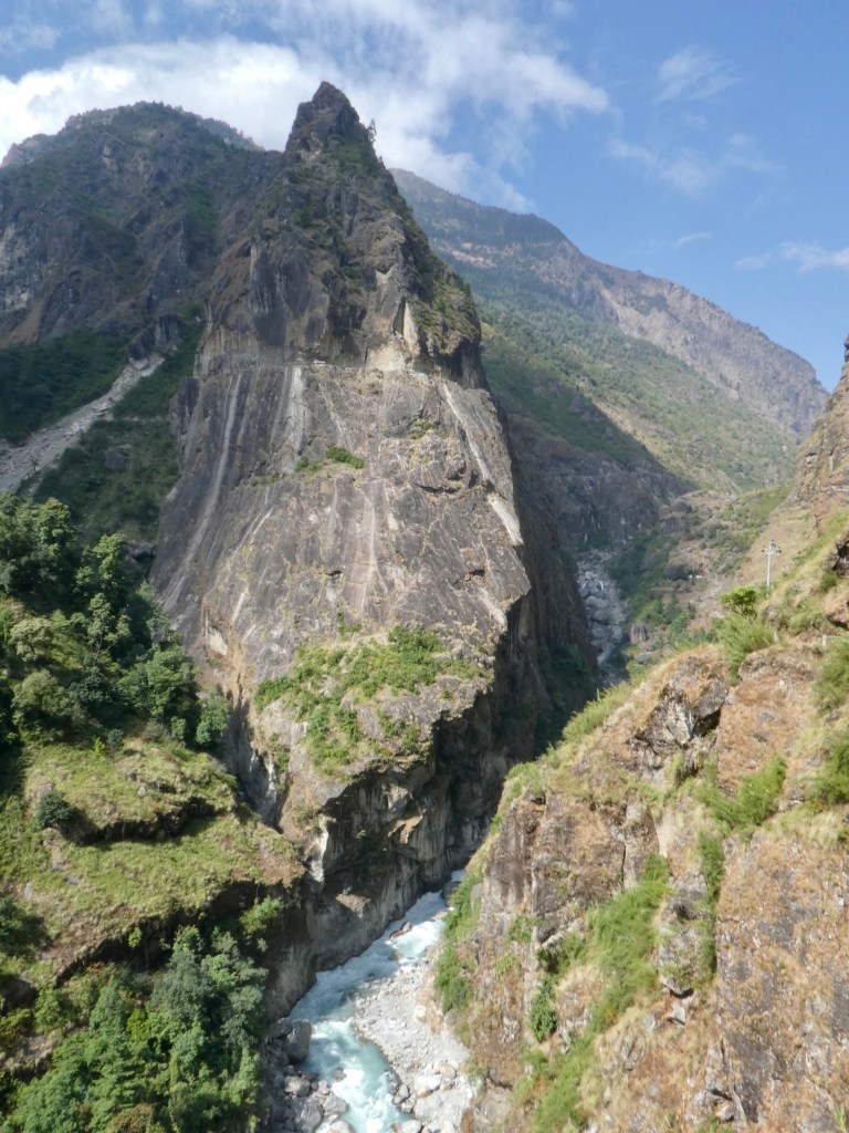 Trotz der Widrigkeiten des Morgens wandern wir um 8 Uhr fröhlich los. Der Weg ist teils sehr spektakulär in die schroffen Felsen gezimmert, mit ziemlich steilem Abhang zum Fluss – ohne Sicherung, versteht sich.