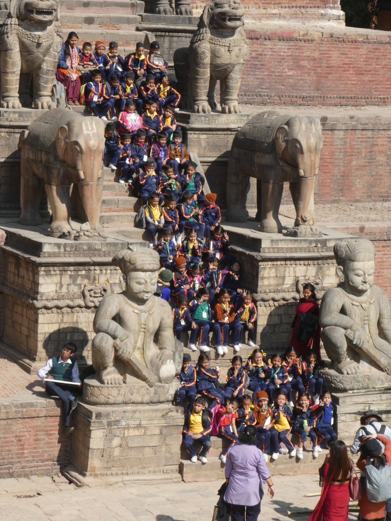 Wir schleichen uns schließlich an den Massen vorbei und besuchen noch den Platz mit einer berühmten Pfauenschnitzerei (die „Mona Lisa“ Nepals).
