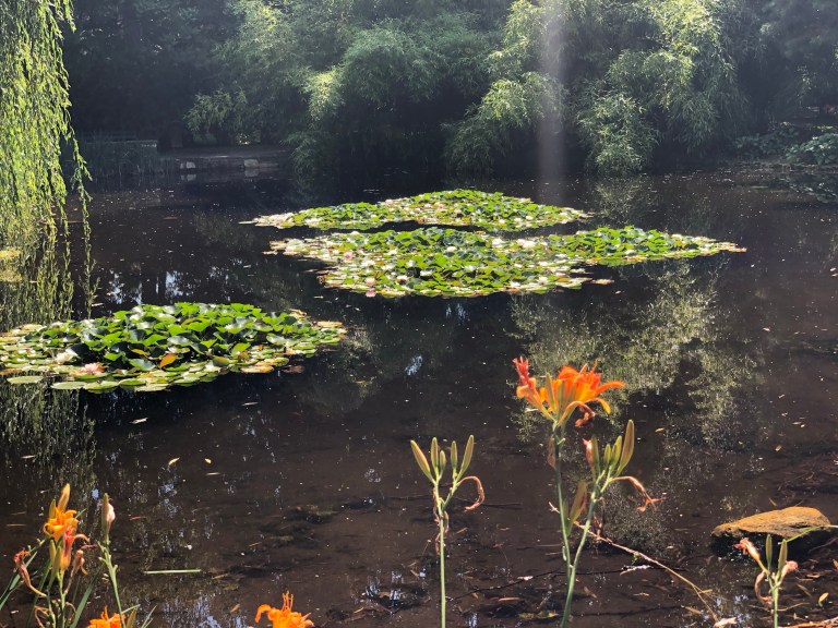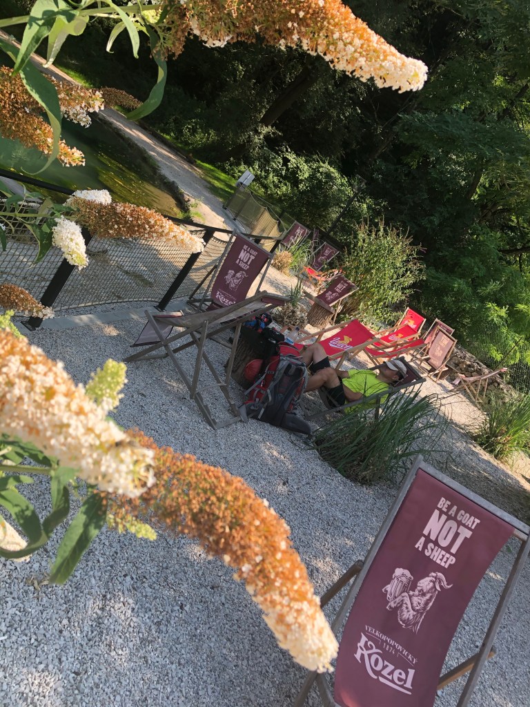 Kaffeepause dort (+ ein großes Eis), dann weiter Richtung Süden. Wo ich im Komoot ein Restaurant lokalisiert habe, das an ein paar Fischteichen liegt, und wo wir uns eine kühle Erfrischung erhofft haben, befindet sich sogar eine Gaststätte (die Restaurants, die wir gestern geortet hatten, gab es dagegen überhaupt nicht mehr). Aber leider ist diese geschlossen – wir machen trotzdem Pause in den Liegestühlen und ich kühle meine Füße ab.