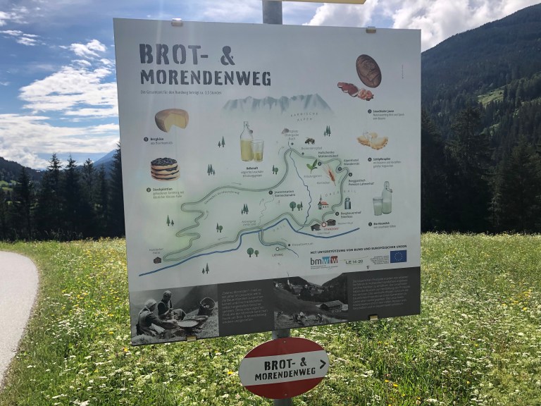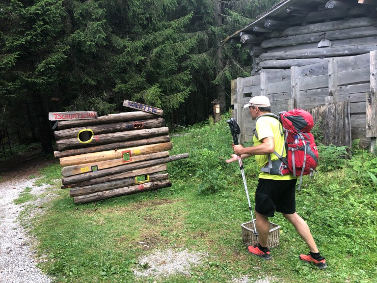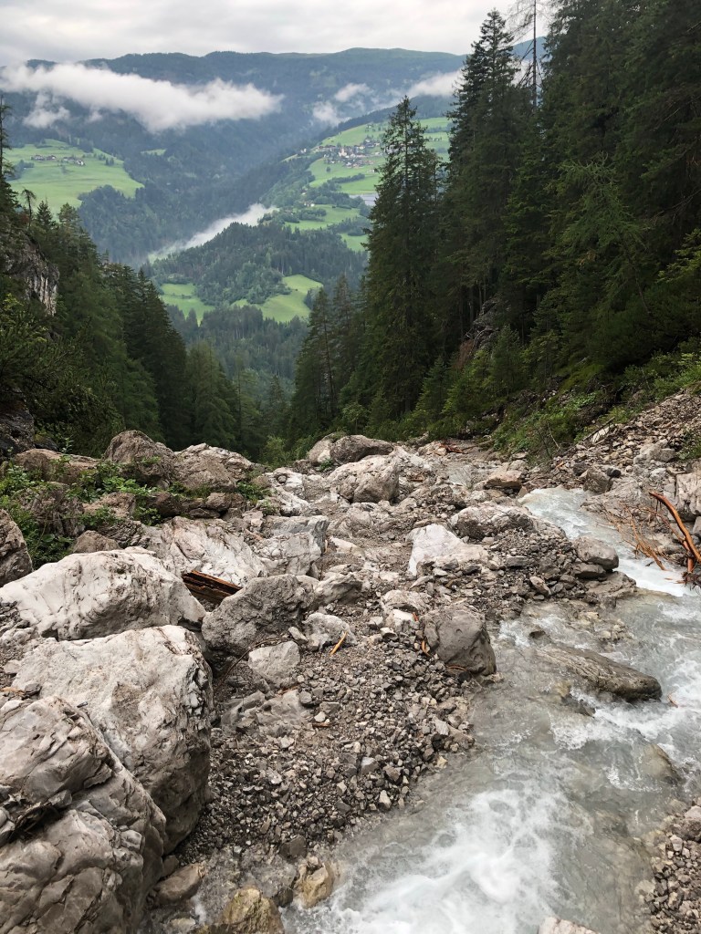 Es geht bergauf, am Bach entlang einen Hohlweg hoch; gerade mal drei Bergläufer kommen uns am Vormittag entgegen, ansonsten ist niemand unterwegs (nur später noch ein 75-jähriger Kärntner E-Biker, der meint er sei jetzt unterwegs, weil Radfahren auf den Forststraßen in dem Gebiet verboten ist, aber die Jäger gerade alle Mittag machen 😉).
