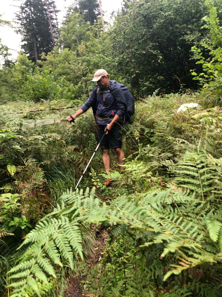 Wir kämpfen uns mit einigen Irrungen zum Teil durch dichtes Gestrüpp (einschließlich meterhoher Disteln) und über versteckte Pfade im Wald den Berg hoch.