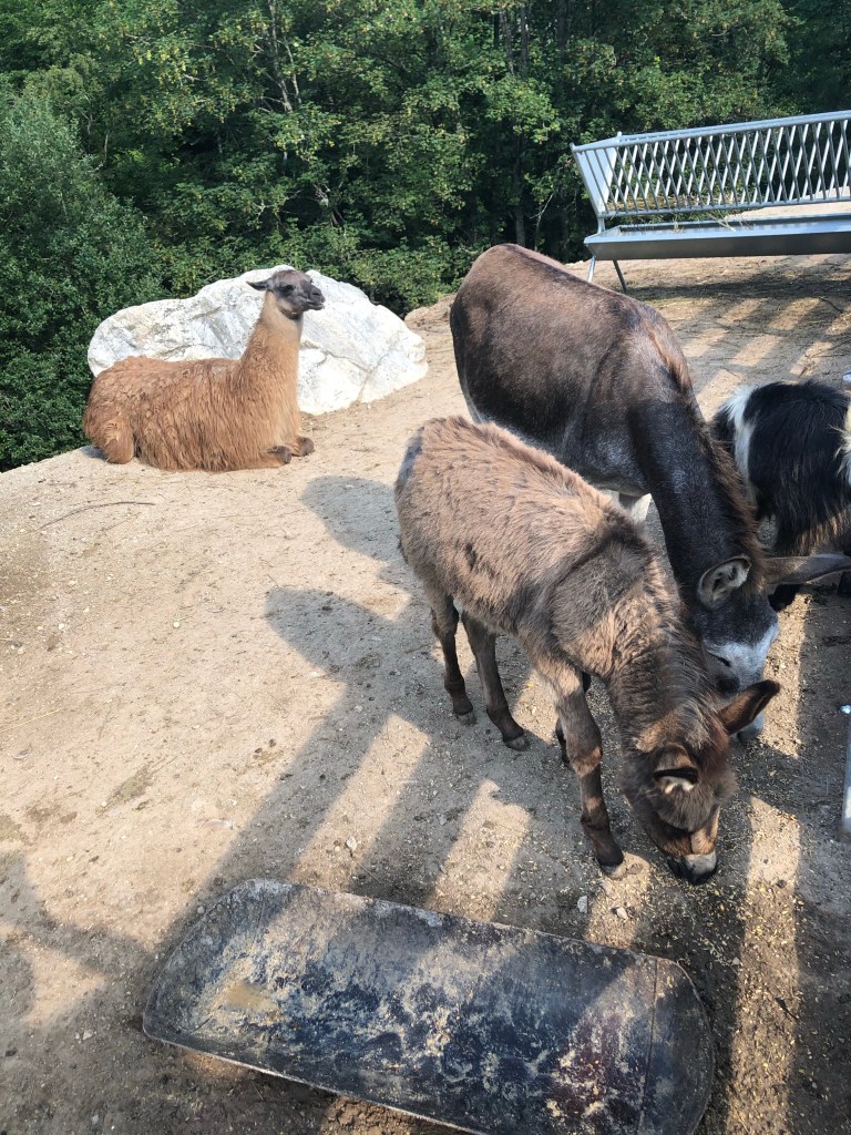Tierische Begegnungen: ein Esel auf dem Weg (diesmal nicht wir selbst!), Lamas, Hängebauchschweine, Ziegen und viele weitere Tiere beim Gasthof „Deutscher Peter“