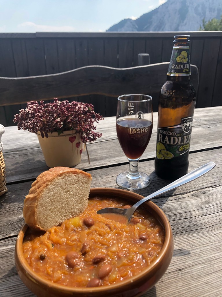 • Das leckere Essen auf der Loiblpass-Hütte (Jota Eintopf und als Nachtisch „Struggli“ – Topfenstrudel)