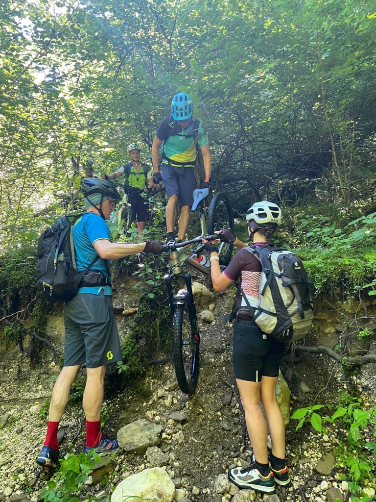 Dann kommt allerdings ein Stück, das auch unsere besten Mountainbiker kaum fahren können (Kategorie S3), was bedeutet, Fahrrad im steilen Gelände eines Waldes runter schieben, teils tragen. Ziemlich anstrengend.