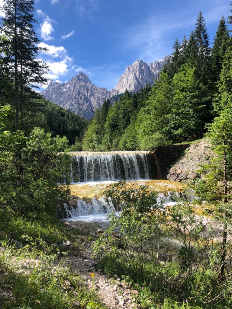 Wir fahren ab Kransjka Gora an einem Bachbett entlang und können die traumhafte Kulisse kaum fassen. Wie für einen kitschigen Kalender gemacht.