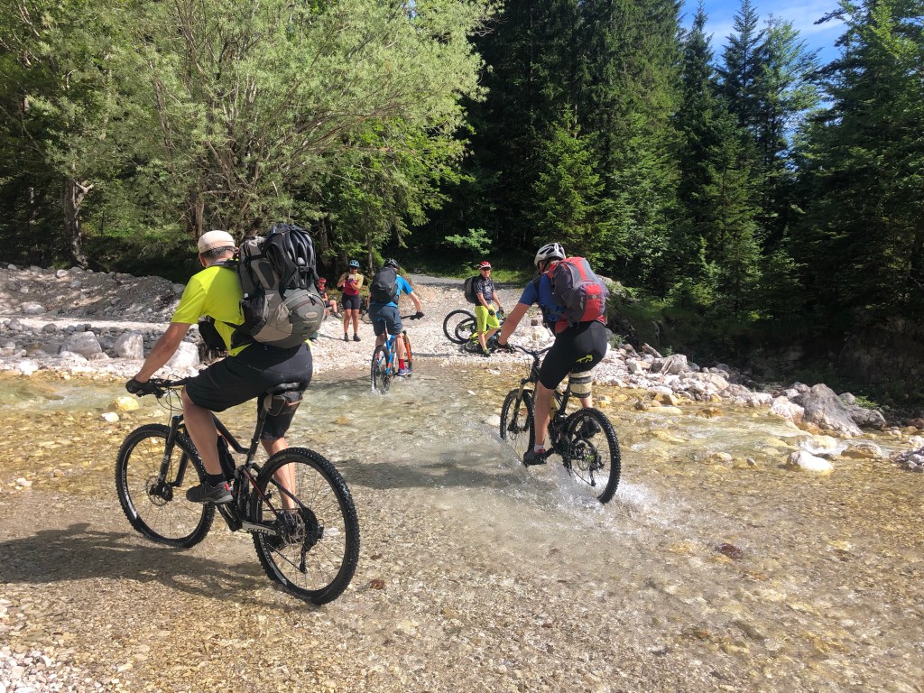 Allmählich geht es bergauf – wir haben heute wieder etwa 1200 Höhenmeter und knapp 50 km vor uns. Vor dem eigentlichen Anstieg zum Vrsic Pass müssen wir noch eine etwas abenteuerliche Bachüberquerung bestehen. Mit trockenen Füßen kommt fast niemand durch, aber alle haben es geschafft, ohne ins Wasser zu fallen.
