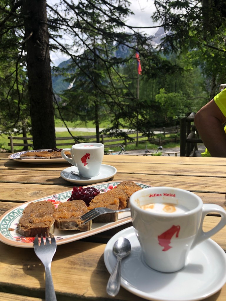 An einer tollen Gaststätte am Pass kehren wir ein. Ein erstes Hüngerchen hat sich doch schon eingestellt. Da kommt der typische slowenische Strudel „Struggli“ mit Walnüssen gerade recht. Sehr lecker.