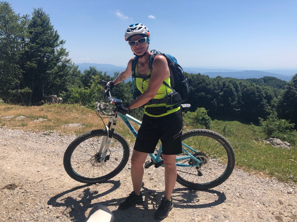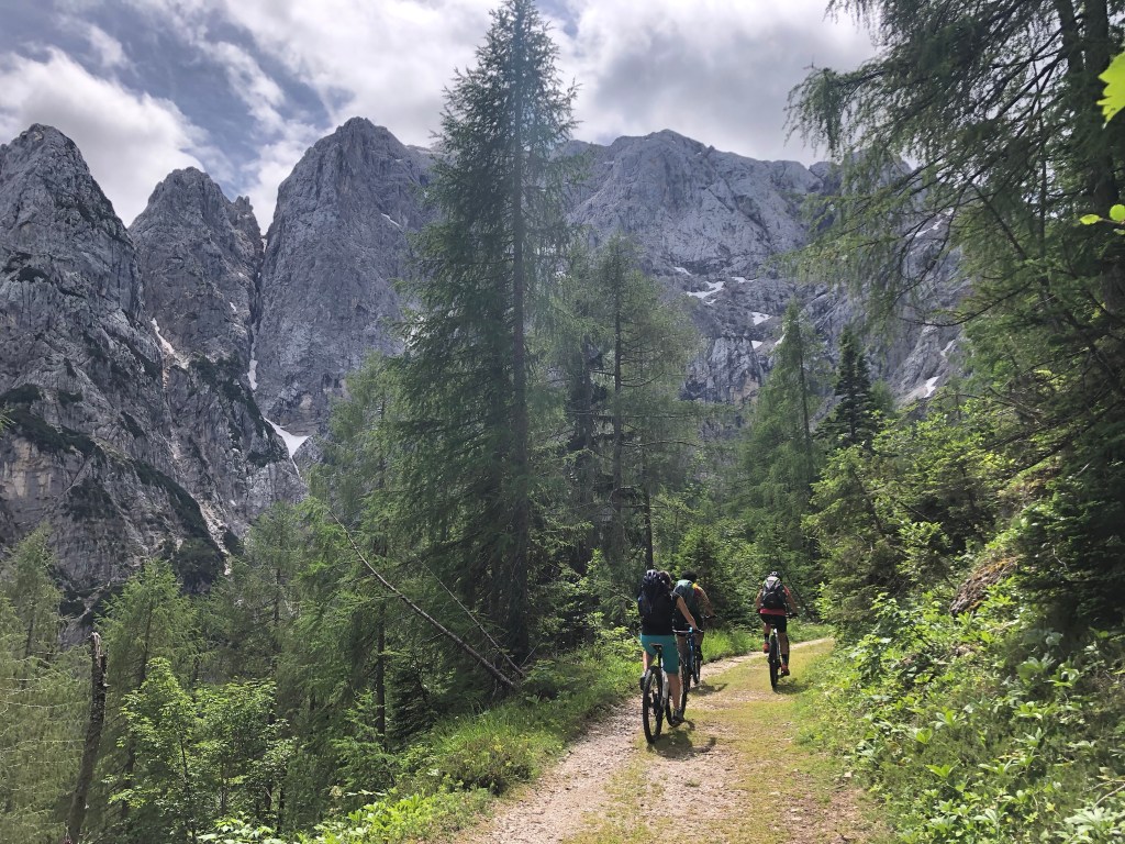 Nachdem sich die Räder und wir etwas ausruhen konnten, geht es bergab. Die Gruppe trennt sich kurzzeitig. Die Freaks und diejenigen, die etwas fitter beim Downhill sind, entscheiden sich für einen Trail, der sich offenbar als etwas schwierig herausstellt. Ein paar von uns (mich eingeschlossen) wählen die leichtere Variante und sausen eine lange und schöne Piste im Wald bis Ratece hinunter. Dort genießen wir gemütlich einen Cappuccino und fahren dann über schöne kleine Wege vorbei an kleinen Bächen nach Kranjska Gora.