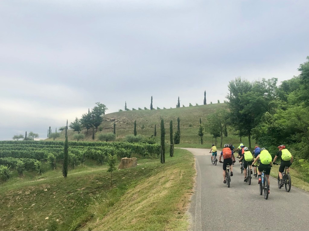 Also strampeln wir noch ein bisschen den Berg hoch, bis wir ein Restaurant mit einem gemütlichen Biergarten finden. Nach der Mittagspause müssen wir nochmal 200 Höhenmeter bei gut 32 Grad schaffen. Gut, dass wir nur zwei Liter Wein zum Essen bestellt haben!