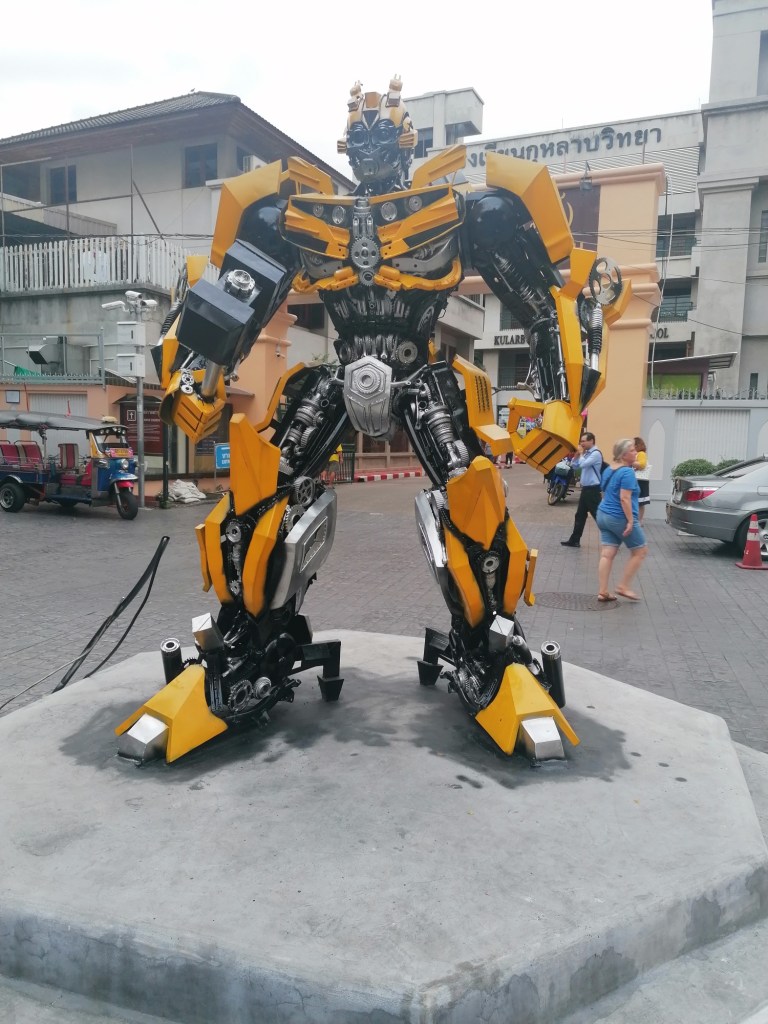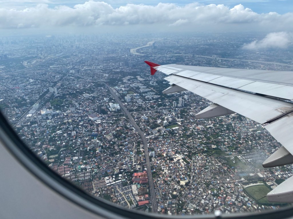 Schon verrückt – nach knapp fünf Stunden Flug kommen wir um 18 Uhr in Bangkok an. Vom Flughafen nehmen wir ein Taxi um in die Innenstadt zu gelangen. Wir sind ja schon erfahren, und wollen uns deswegen erst nicht auf den Fixpreis des Fahrers einlassen, müssen dann aber klein beigeben, da er uns ansonsten mit extra Gebühren fürs Gepäck (das bei uns gerade lächerlich klein ausfällt, mit 10 und 13 kg) und die Benutzung der Schnellstraße droht. Wir wollen am Ende bei 16€ für eine gute halbe Stunde Fahrt nicht zum Diskutieren anfangen und lieber schnell ins Hotel kommen. Dass wir mit der alten Klapperkiste überhaupt ankommen grenzt allerdings an ein Wunder 🙈!