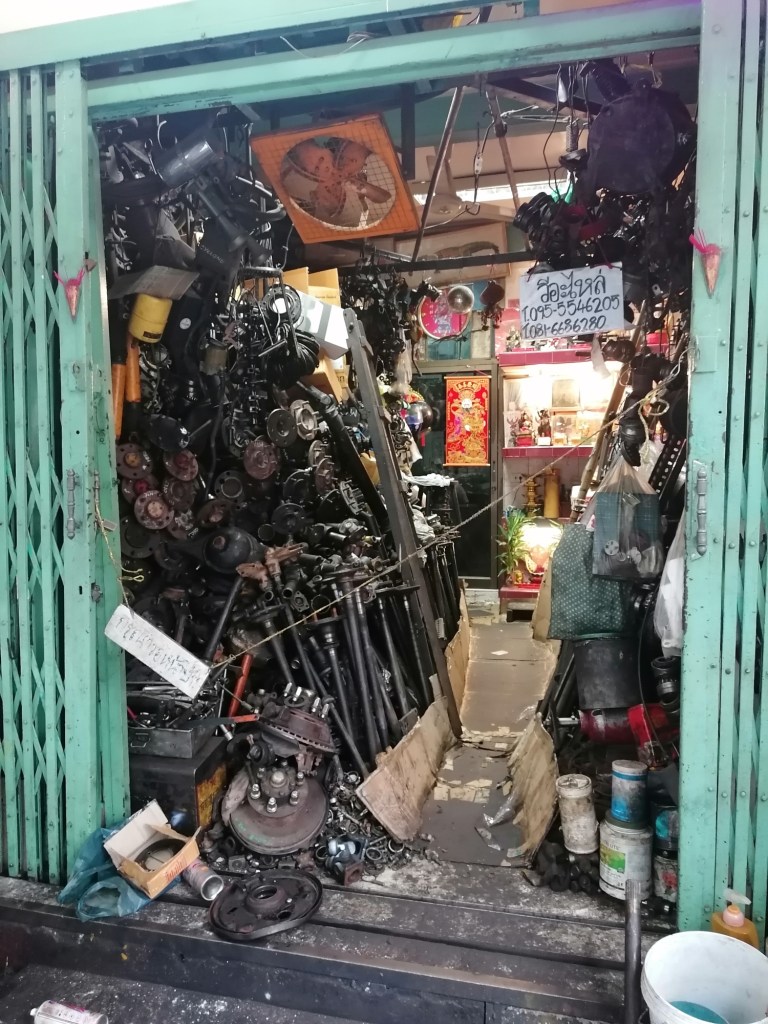 Die Straßen sind hier immer thematisch organisiert. Es gibt zum Beispiel die Buddha-Straße, wo man Buddhafiguren in allen Größen und Farben kaufen kann. Dann – als krasser Gegensatz – die Waffengasse, wo man in den Schaufenstern alle möglichen Pistolen und Gewehre zu sehen bekommt. Außerdem Straßen, die sich auf Stoffe spezialisiert haben, andere auf Schmuck, wiederum andere auf Blumen, etc.