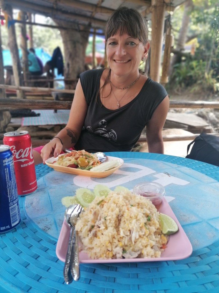 Hier essen wir eine Kleinigkeit zu Mittag – Papayasalat und Fried Rice. Das geht immer!