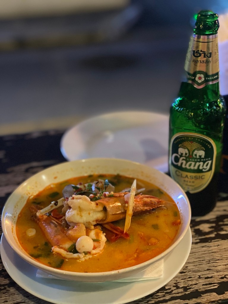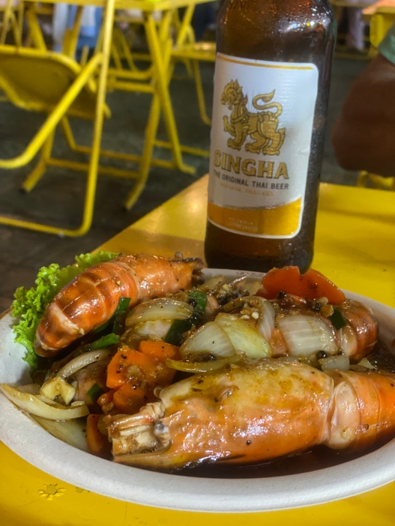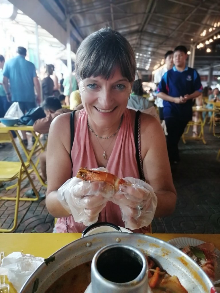 Danach ziehen wir noch kurz los, treffen zwei Freundinnen, die zufällig wie einige andere Freunde gerade in Thailand sind, genießen Tom Yum Suppe mit Riesengarnelen (medium hot brennt doch ordentlich) und dazu ein kühles Chang Bier.