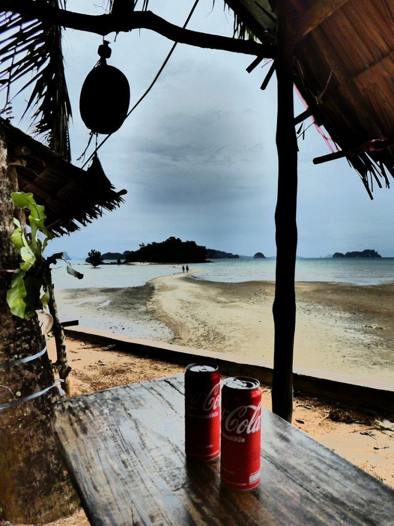 Es gibt auch eine Art Beachbar, die riesig ist und wo man sich gut vorstellen kann, einen Cocktail zu schlürfen. Auch hier sind keine Gäste da – dafür ein paar gelangweilte Thais an der Bar. Gnädigerweise bemüht sich eine Dame uns zwei Dosen Singha Light zu verkaufen. Ich glaube, die müssen sich alle erstmal warmlaufen – so am Anfang der Saison 😅.