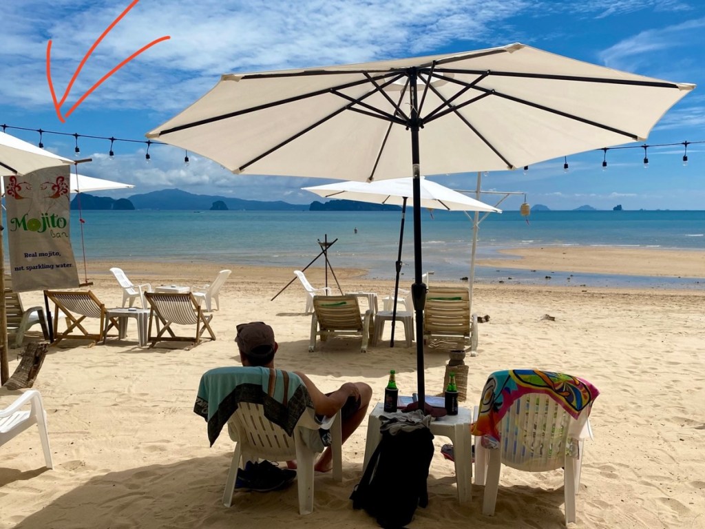 Bevor es etwas zu regnen anfängt, finden wir Zuflucht in einer schönen Strandbar.