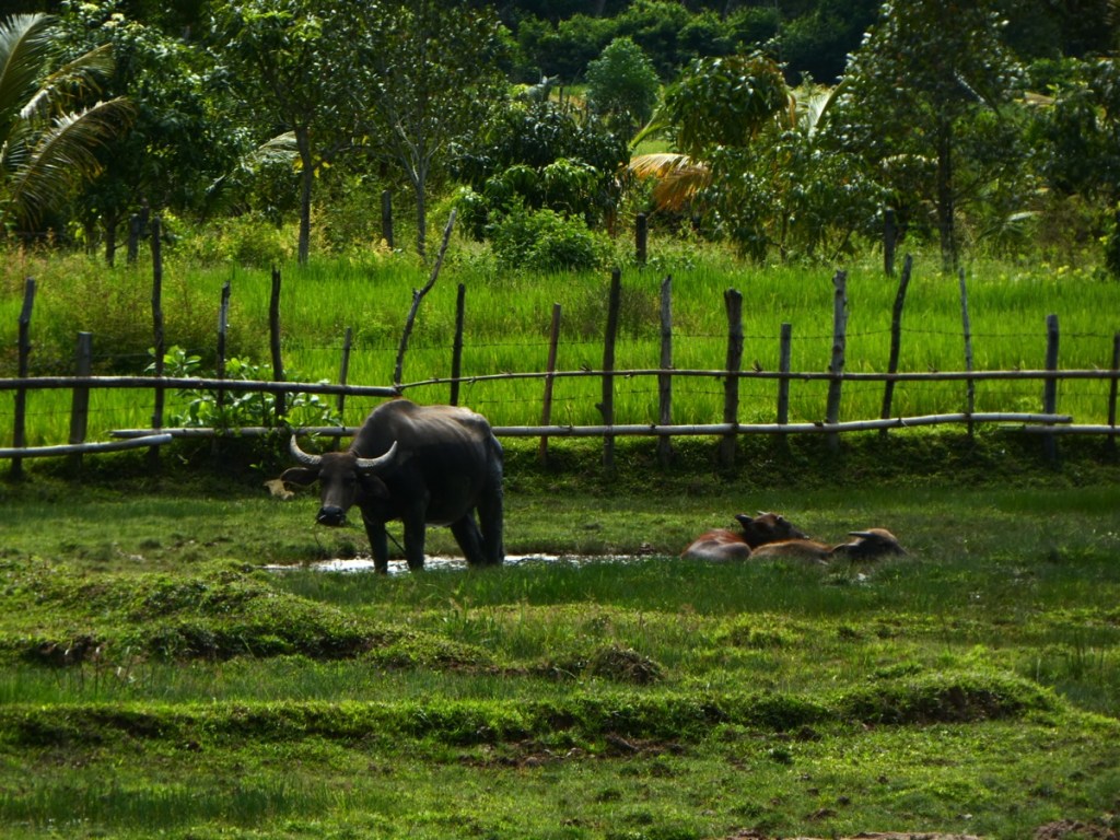 Wir fahren an unzähligen Reisfeldern vorbei, und zwischendurch wird es sogar ein bisschen gebirgig. Auf halber Strecke machen wir eine Pause. An einer Raststation, wo ein kleiner Adler am Fenster sitzt (angebunden), eine Katze neben der Kasse auf der Theke liegt und ein Hund auf der Toilette schläft, bekommen wir kostenloses Mittagessen.