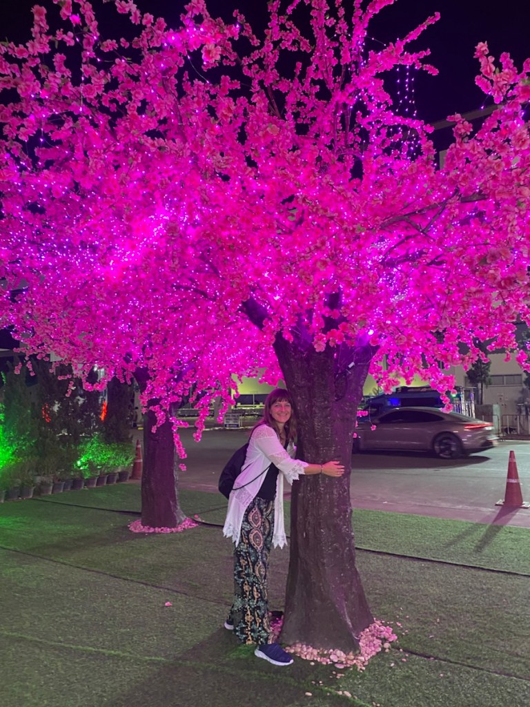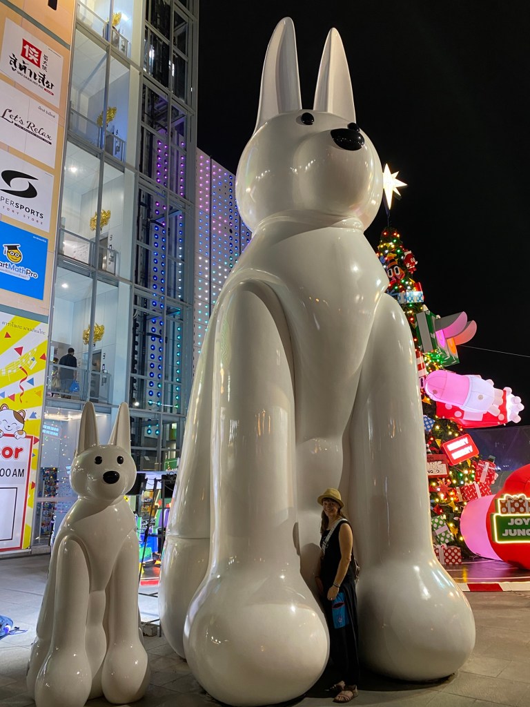 Wir waren letztes Jahr schon dort – damals fand ich es bereits sehr „interessant“, dass neben den Heiligtümern, vor denen Gläubige beten, ein riesiger Weihnachtsbaum stand. Dieses Jahr wird das allerdings noch getoppt! Zusätzlich zur Weihnachtsdekoration haben die noch einen überdimensionalen Hasen auf den Platz gestellt.