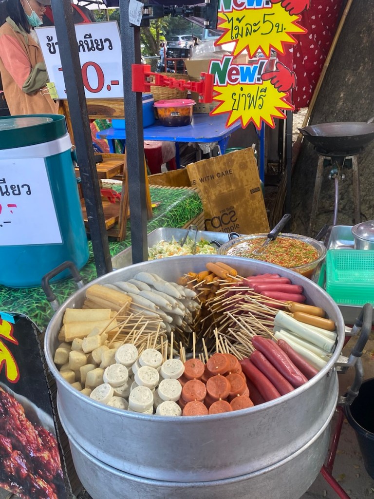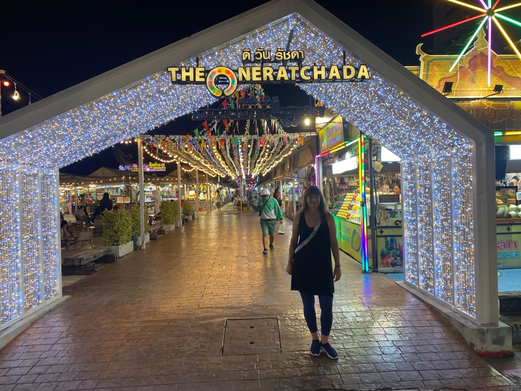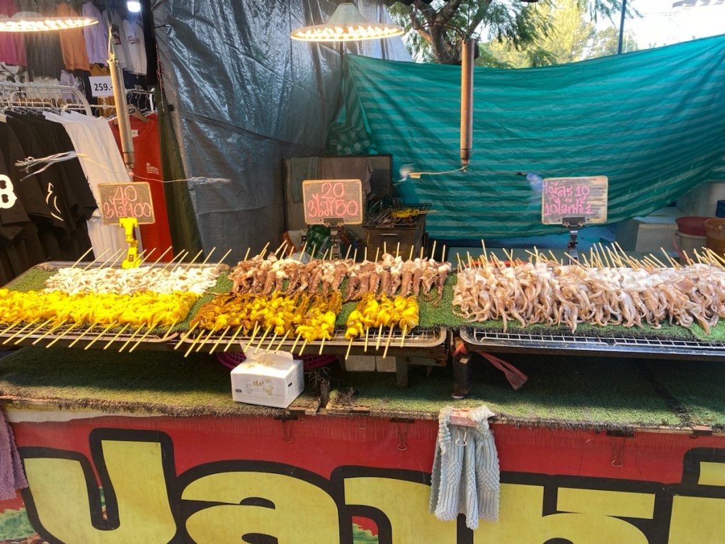Am Abend ziehen wir nochmal los. Wir wollen wenigstens in Bangkok auch noch einen Nachtmarkt besuchen. Leider ist es schon spät und deswegen können wir nicht allzu weit fahren. Wir nehmen die Metro bis Phraya Thai. Der „The One Ratchada“ Nachtmarkt ist nicht weit weg, ein relativ neuer Markt mit netten Leuten, die uns auch um 23 Uhr noch was zu essen verkaufen. Um diese Zeit ist jedoch nicht mehr viel los.