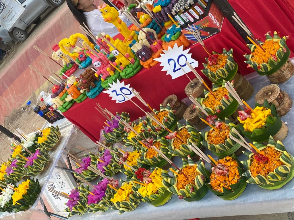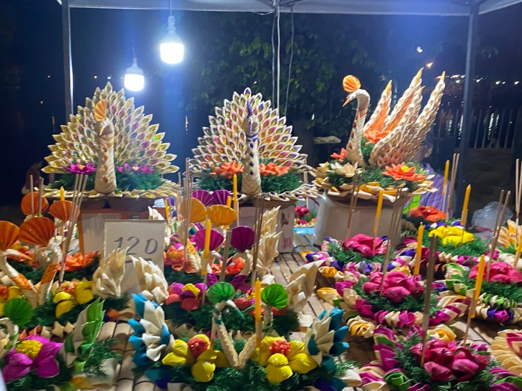 Am Mae Nam Ping Fluss entlang, auf den Brücken und in der Innenstadt werden überall noch Lampions aufgehängt, Lichterketten montiert und vor allem die unzähligen Bötchen aus Blumenschmuck, Maiscrackern und ähnlichem mit Kerzen gebastelt, die überall zum Kauf angeboten werden.