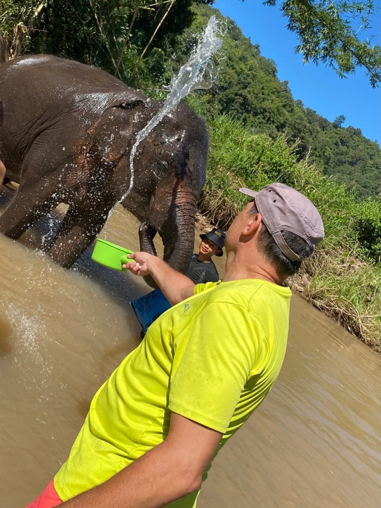 Wir bekommen Becher, mit denen wir Wasser schöpfen und die Elefanten nassspritzen dürfen. Und die revanchieren sich prompt mit einer kräftigen Dusche aus ihrem Rüssel.