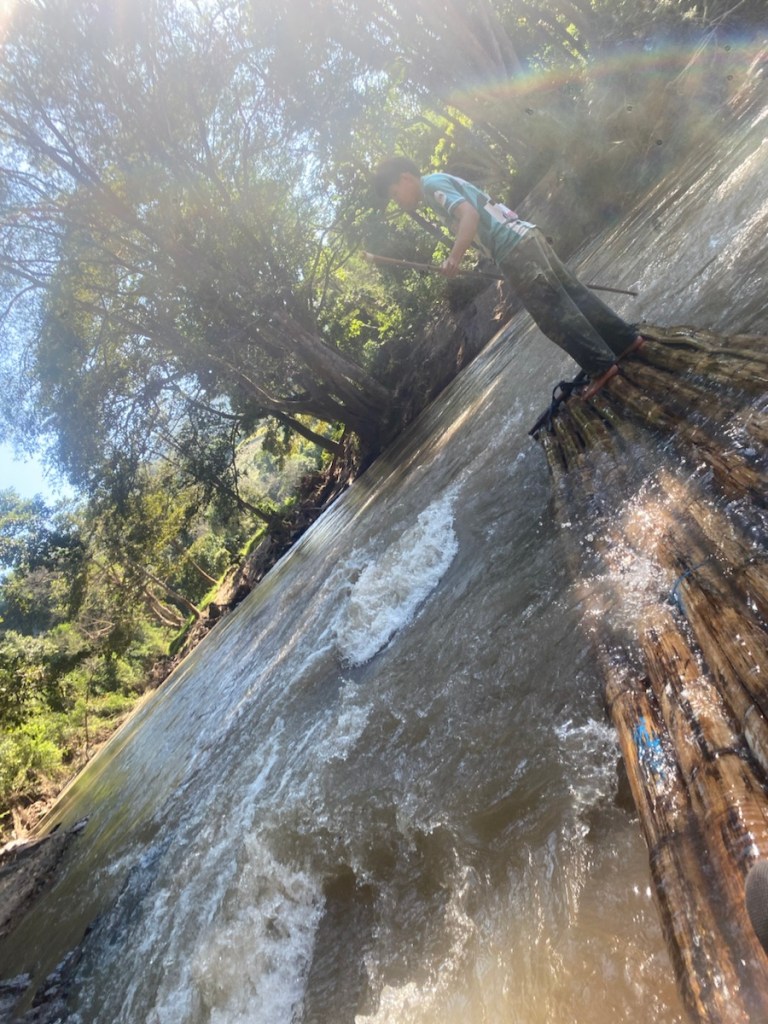 Bambus-Rafting steht zum Abschluss auf dem Programm! Wir selber müssen allerdings nichts tun, außer ruhig auf dem Floß sitzen und die Fahrt zu genießen.