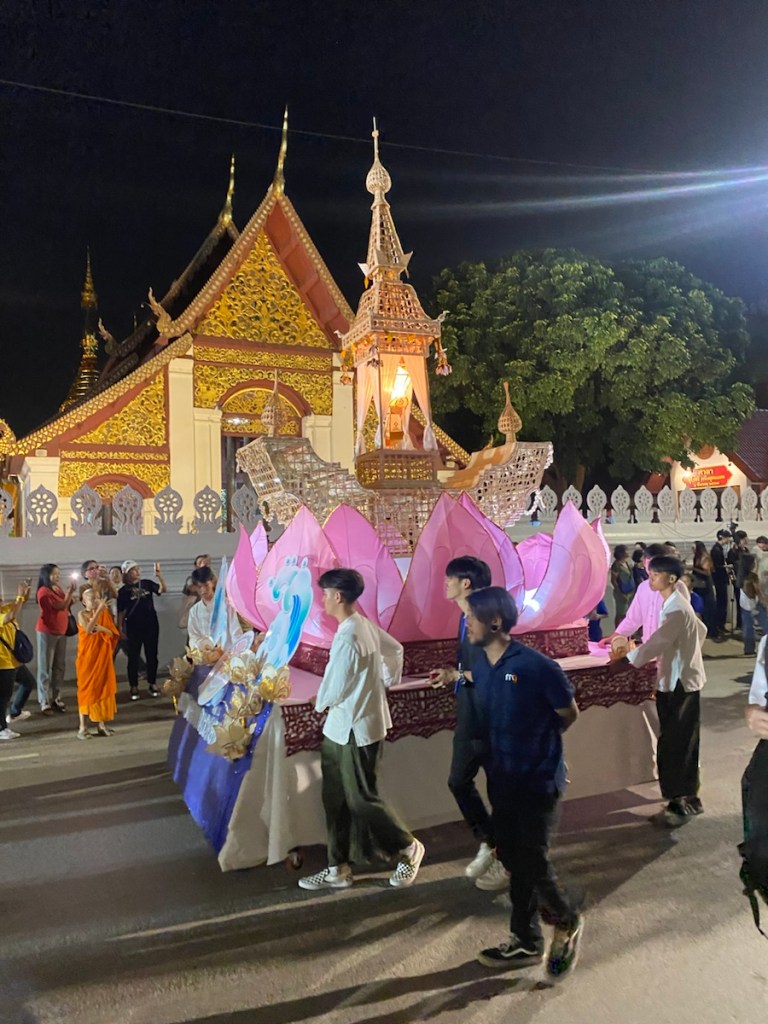 Zwischen den Wägen geben Musikgruppen ihr Bestes. Da wir Hunger haben und der Umzug sicher eine ganze Weile dauert, warten wir nicht alle Gruppen ab. Dafür kämpfen wir uns durch die Masse zum Nachtmarkt und später zum Fluss vor. Auf dem Weg kommen wir an zahlreichen Ständen vorbei, die zum Teil sehr kunstvolle Bötchen gefertigt haben.