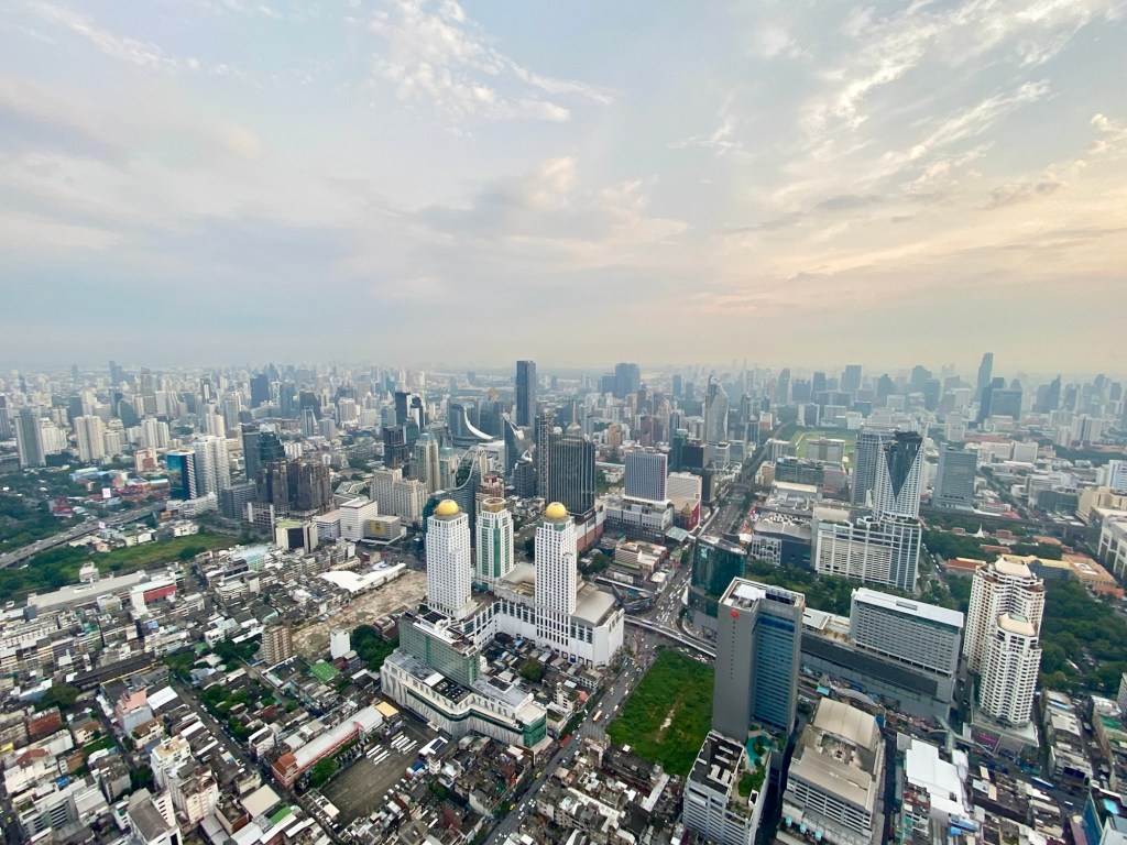 Frisch gestärkt fahren wir ein Stück mit der Bahn und laufen dann zum „Baiyoke Tower 2“, dem dritthöchsten Gebäude Thailands, mit 304 Metern (ohne Antenne). Der Turm beinhaltet auch ein Hotel, ein Restaurant und eine Rooftop Bar.