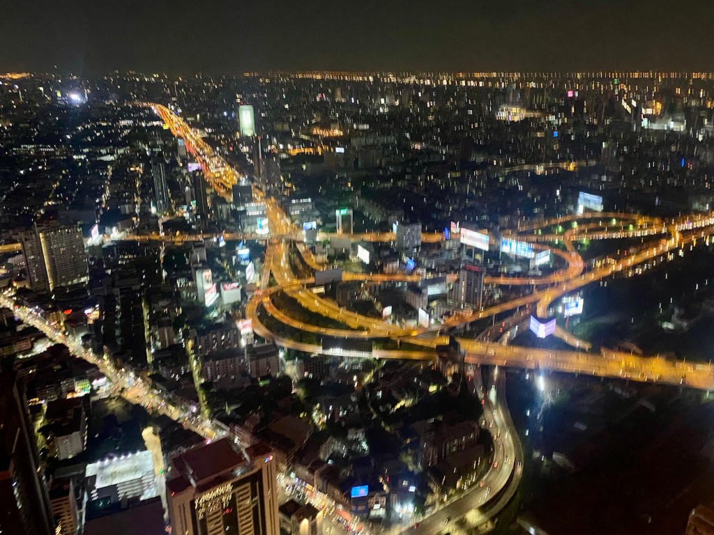 Wir wollen uns die Aussicht auch bei Nacht nicht entgehen lassen, und deswegen bleiben wir auf ein zweites Getränk in der Bar, um nach Sonnenuntergang nochmal auf die Aussichtsplattform im 84. Stock zu gehen. Wirklich beeindruckend, der Blick auf diese Megacity.