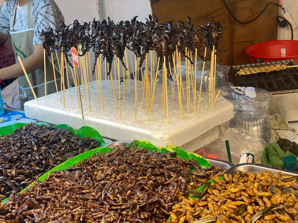 Vor kitschiger Kulisse spielt eine Liveband und zu unserer Überraschung ist das der erste Markt, wo wir Insekten, Würmer und Skorpione sehen, die zum Verzehr angeboten werden.
