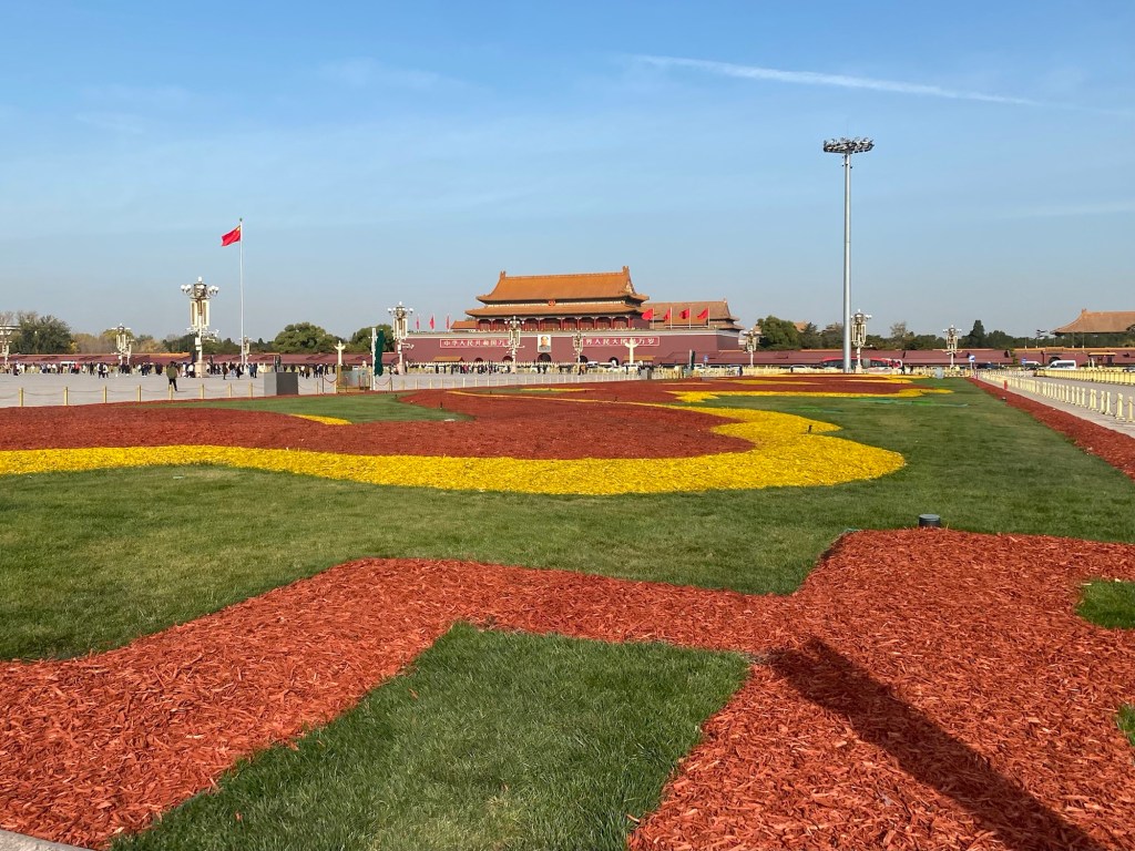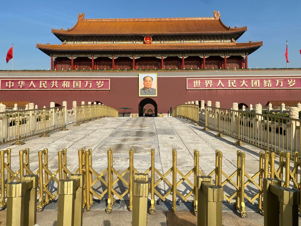 Diesmal sind wir besser vorbereitet. Für den „Tian’an men-Platz“ haben im Vorfeld online Karten reserviert (à 5 €). Mit diesem Ticket und dem Reisepass kommen wir schließlich ganz „einfach“ auf den Platz, nachdem man ein paar Kontrollposten passiert hat und unsere Taschen genau unter die Lupe genommen werden. Unser „Alpencross 2021“ Handtuch weckt großes Interesse – könnte es ja eine Flagge einer antikommunistischen Vereinigung sein, die wir auf dem Platz des Himmlischen Friedens hissen wollen. Wir versuchen das aufklären, und als auch noch Wechselunterwäsche zum Vorschein kommt, glauben uns die eifrigen Beamten, dass wir keine Revolutionäre, sondern nur Touristen auf der Durchreise sind. Ist wirklich unglaublich hier, mit welchem Aufgebot an Überwachungsbeamten, Kameras etc. gearbeitet wird.