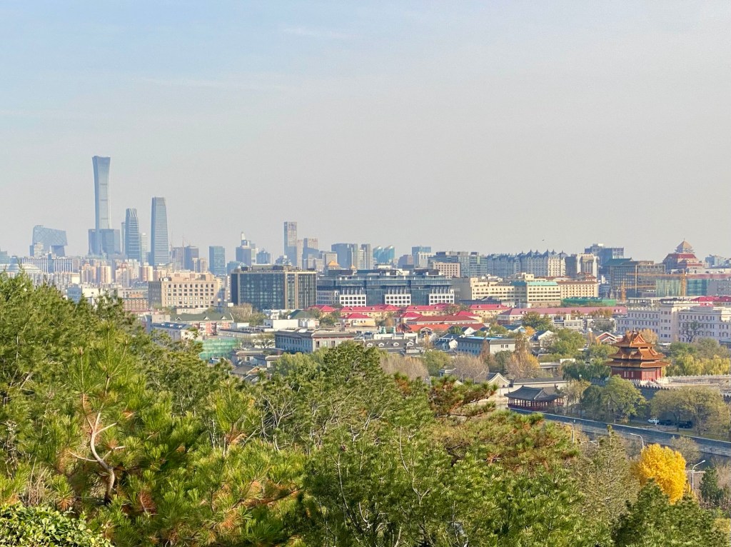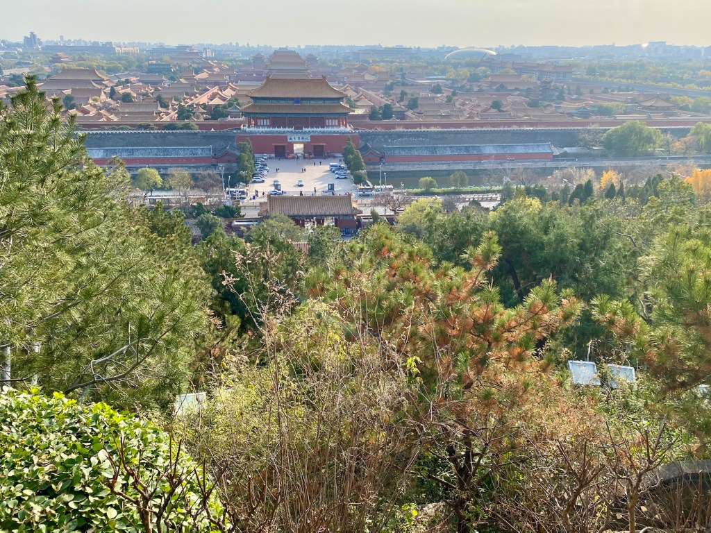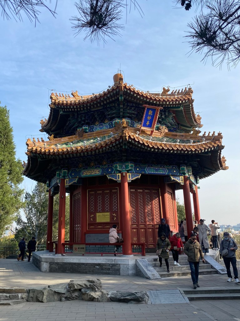 Wir sind jetzt auf der Rückseite der Verbotenen Stadt und wandern den Hügel im „Jin Shan Park“ hoch! Hier gibt es tolle kleine Tempel und Pagoden und man hat einen guten Blick über die Stadt.