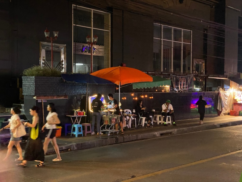 Später beobachten wir noch kurz das bunte Treiben – wo irgendwelche Spirituosenstände mitten auf dem Gehweg mit Hingabe aufgebaut werden, oder wo immer irgendjemand einen Anhänger mit Leckereien wie komischen Würsten, rohen Eiern oder auch Insekten durch die Straßen fährt.