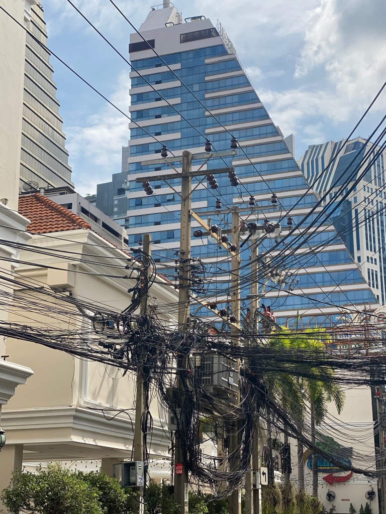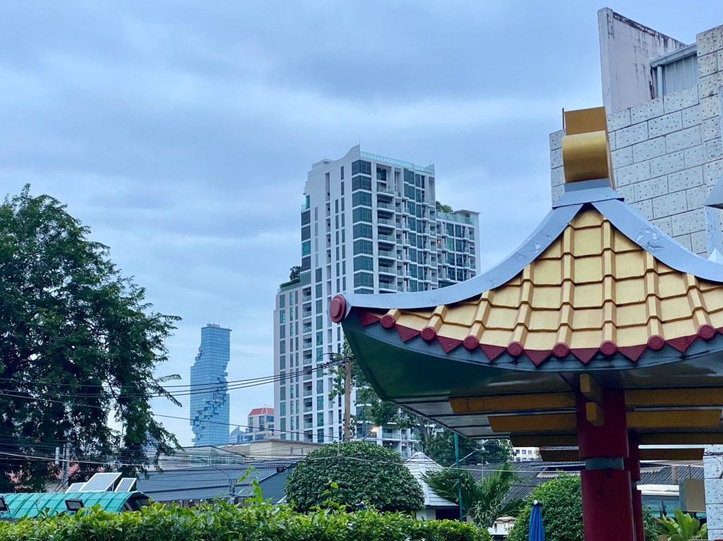 Allmählich dämmert es. Wir sind schon einiges gelaufen, daher schaffen wir es nicht mehr, bis zu dem etwas seltsamen Gebäude namens „Maha Nakhon“ zu wandern, was uns auch noch interessiert hätte.