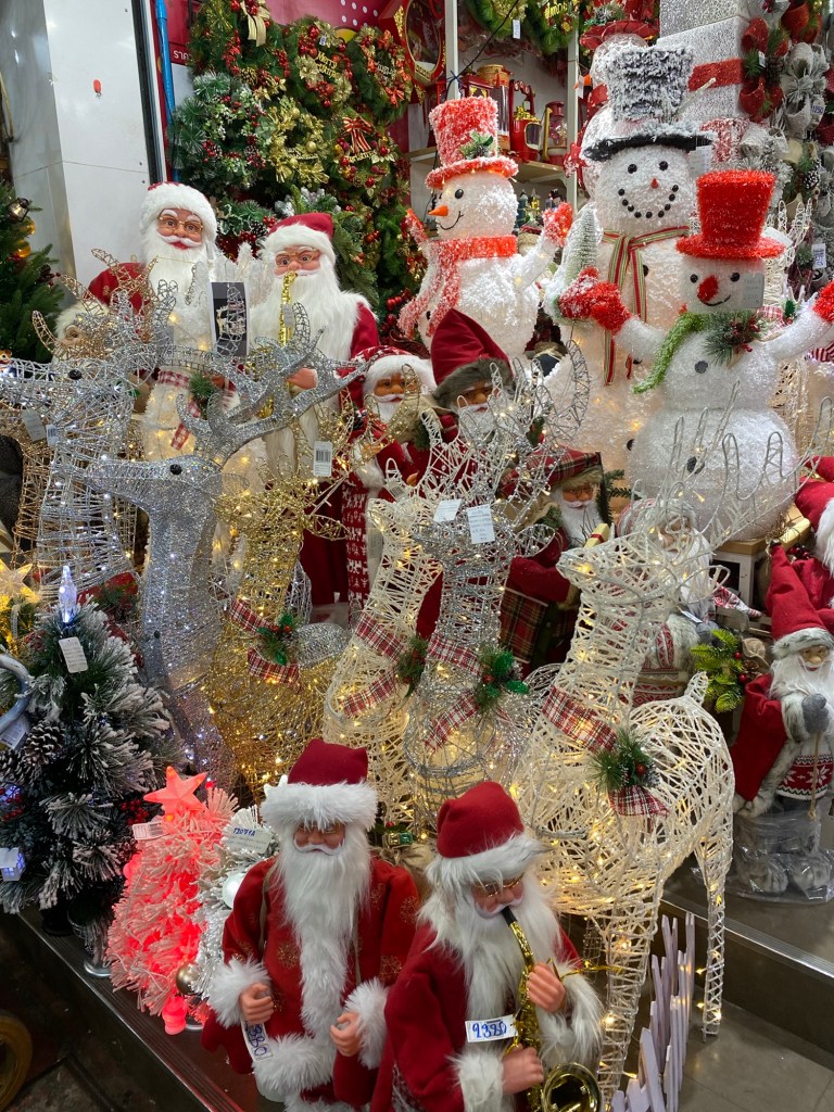 Der Kitsch auf dem riesigen Markt in Chinatown ist kaum zu überbieten. Es gibt alles was man sich vorstellen kann, und was niemand braucht, Hauptsache es ist bunt und aus Plastik, wie die tolle Weihnachtsdekoration, die überall feil geboten wird.
