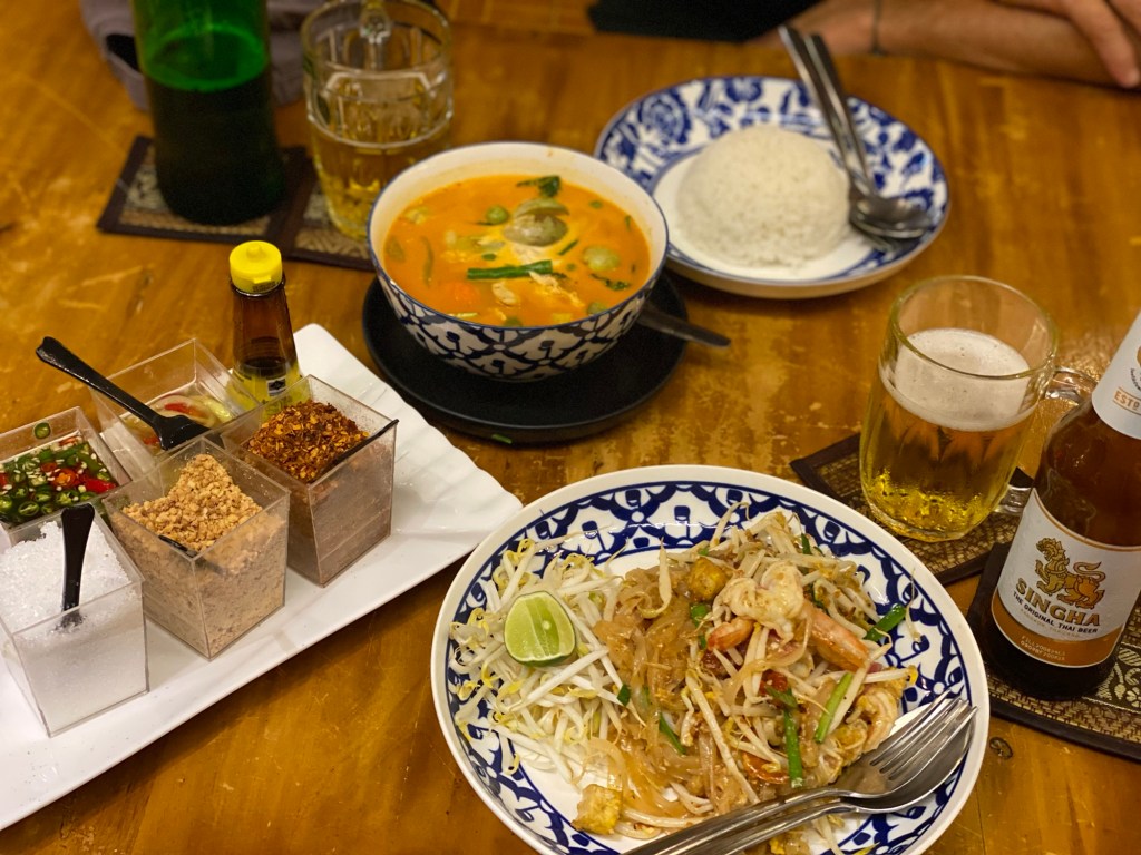 Vom vielen Laufen bekommen wir Hunger. Am Weg finden wir ein sehr gemütliches Lokal, das „Kwanren Kitchen“ Restaurant, wo wir feines Hühnchencurry und Padthai mit Shrimps essen.