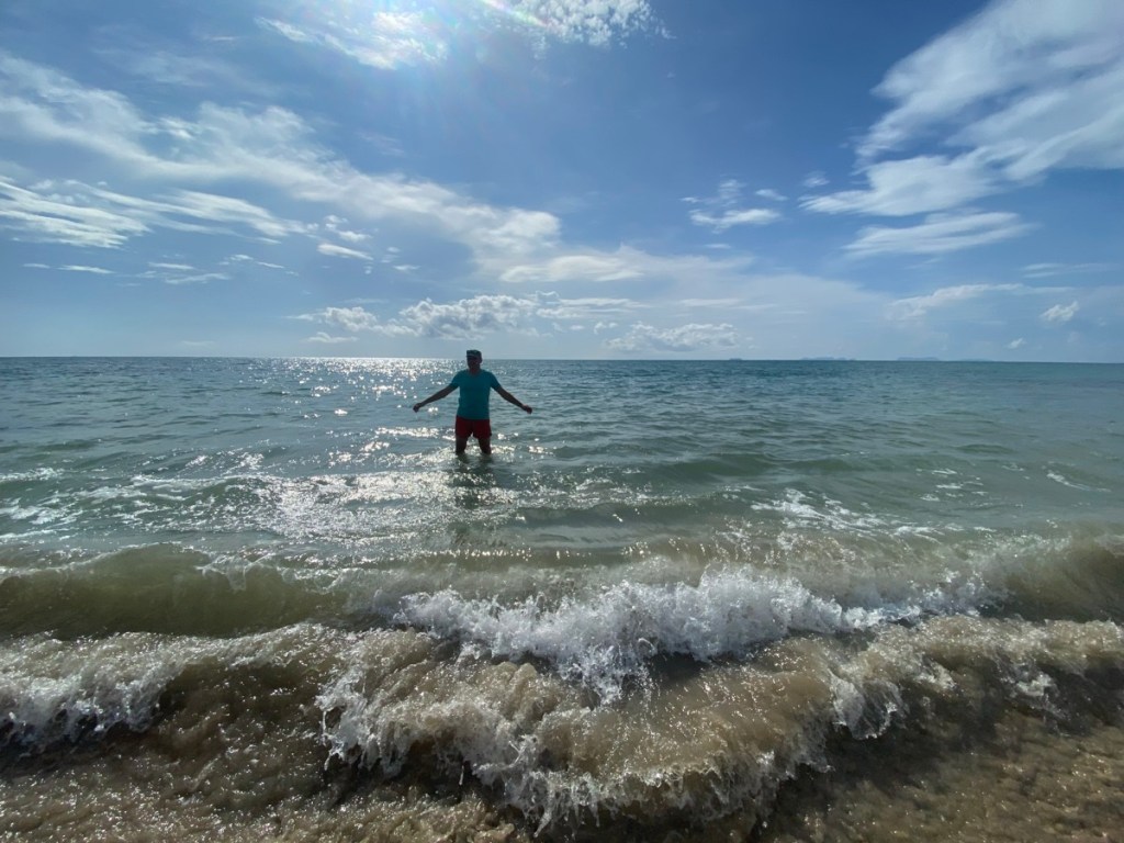 Wir genießen das Wasser (badewannenwarm) in vollen Zügen. Außer uns ist gerade mal eine Handvoll Leute am Strand!