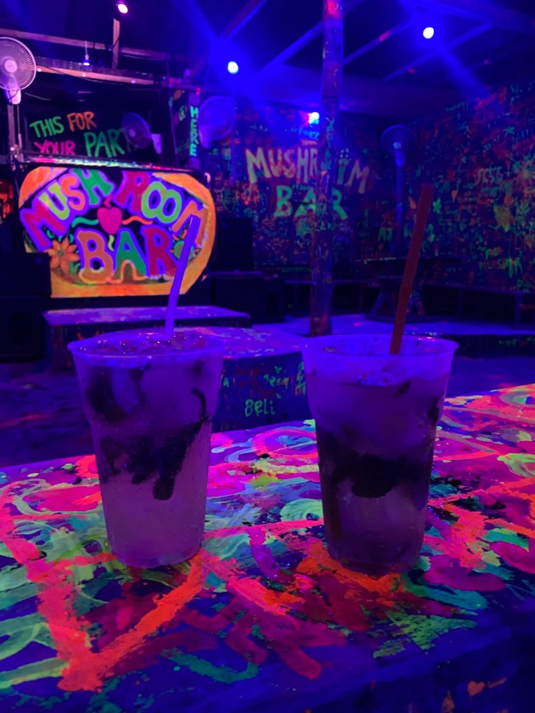 In der „Mushroom Bar“, in der wir den Abend beenden, leuchtet auch alles – in grellen Neonfarben.