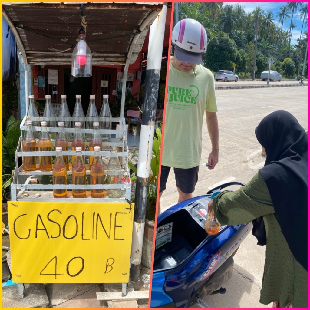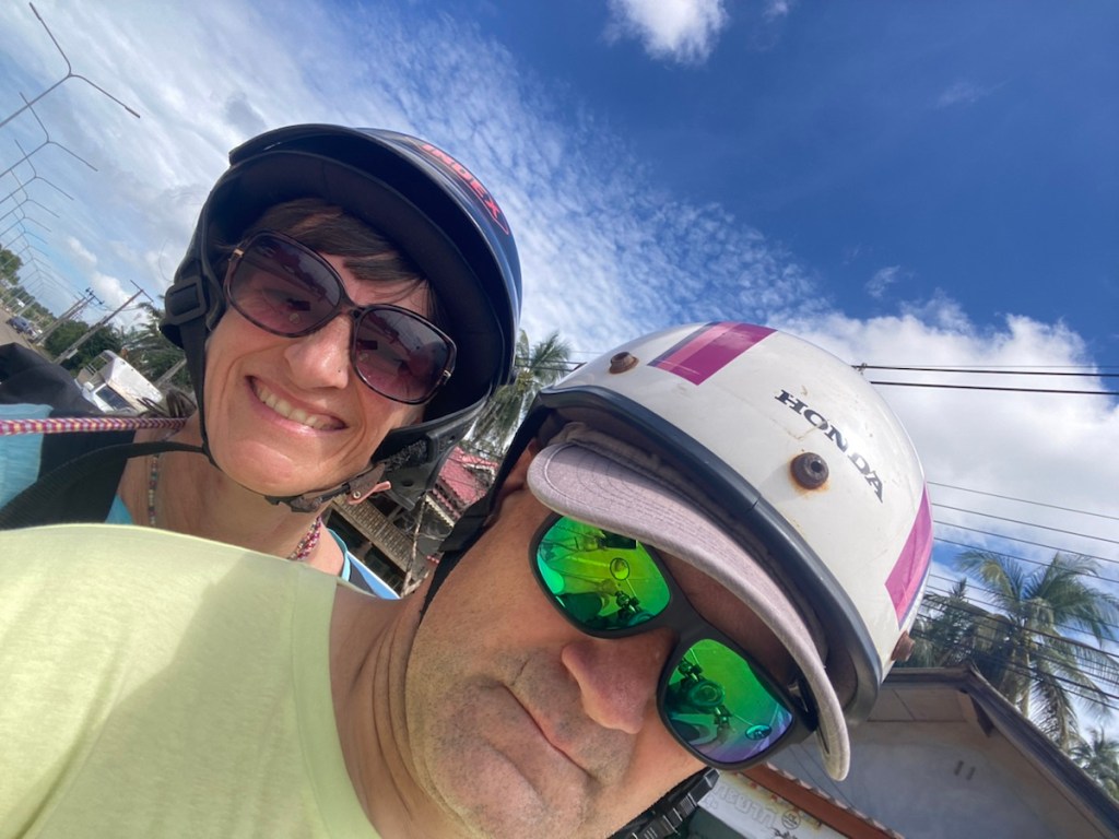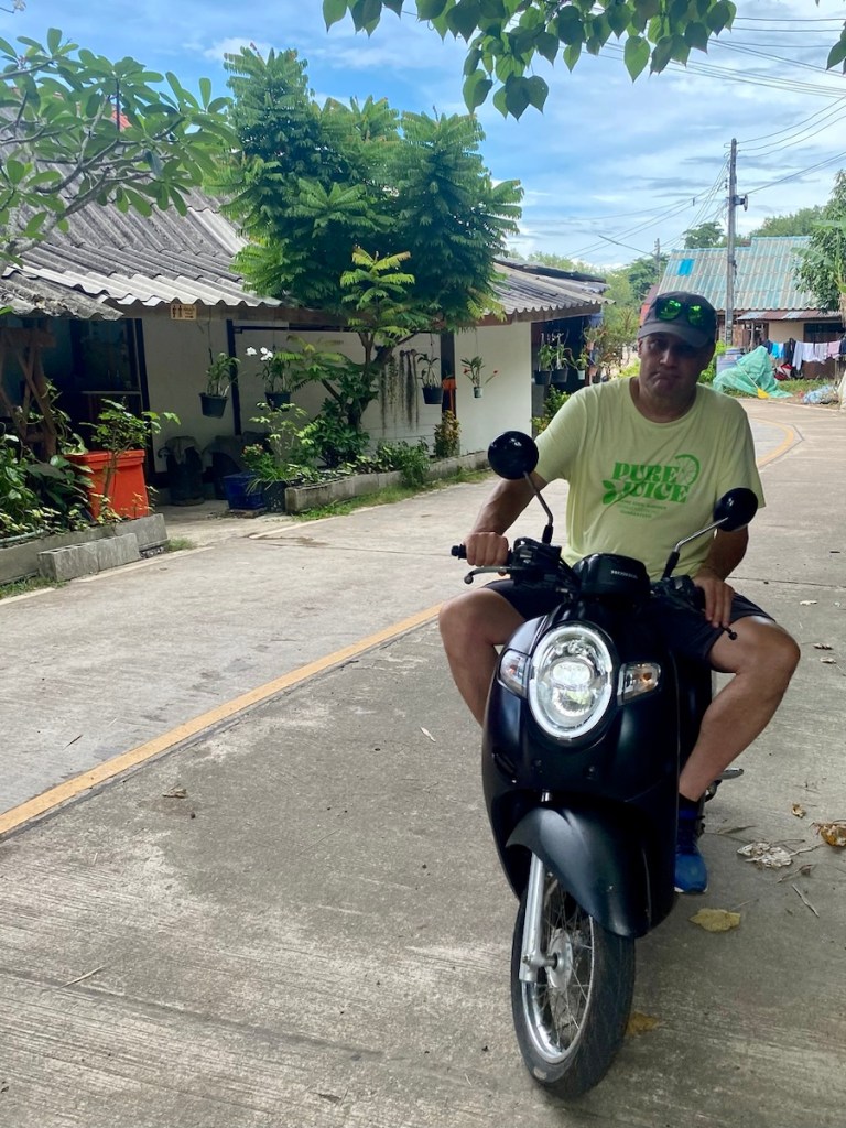 Mit einem Roller, den wir für 200 Baht (5,40€) ausgeliehen haben, geht die Tour los, nachdem wir am Strand lecker gefrühstückt haben.