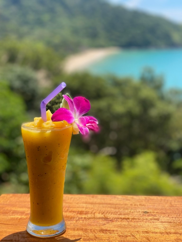 Im Restaurant oberhalb genießen wir den Blick auf den Strand – mit einer leckeren Suppe und einem Frucht-Shake.