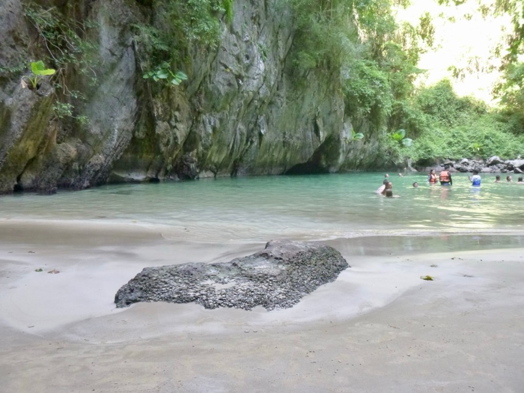 Wir müssen durch die 80 Meter lange, stockdunkle Höhle schwimmen, bis wir am anderen Ende an einem kleinen Strand rauskommen. Verrückt 🙈.