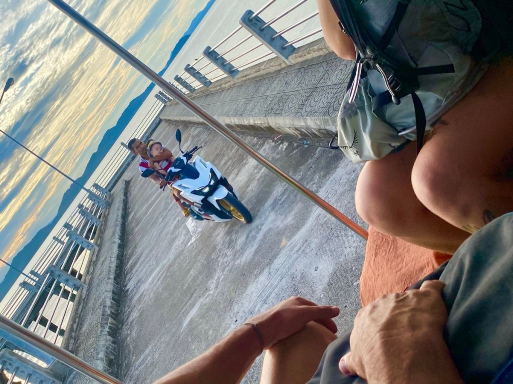 Der Roller ist nicht besonders motorisiert, so dass wir jedes Mal froh sind, wenn wir eine 15-prozentige Steigung schaffen, ohne dass ich absteigen muss 😅.